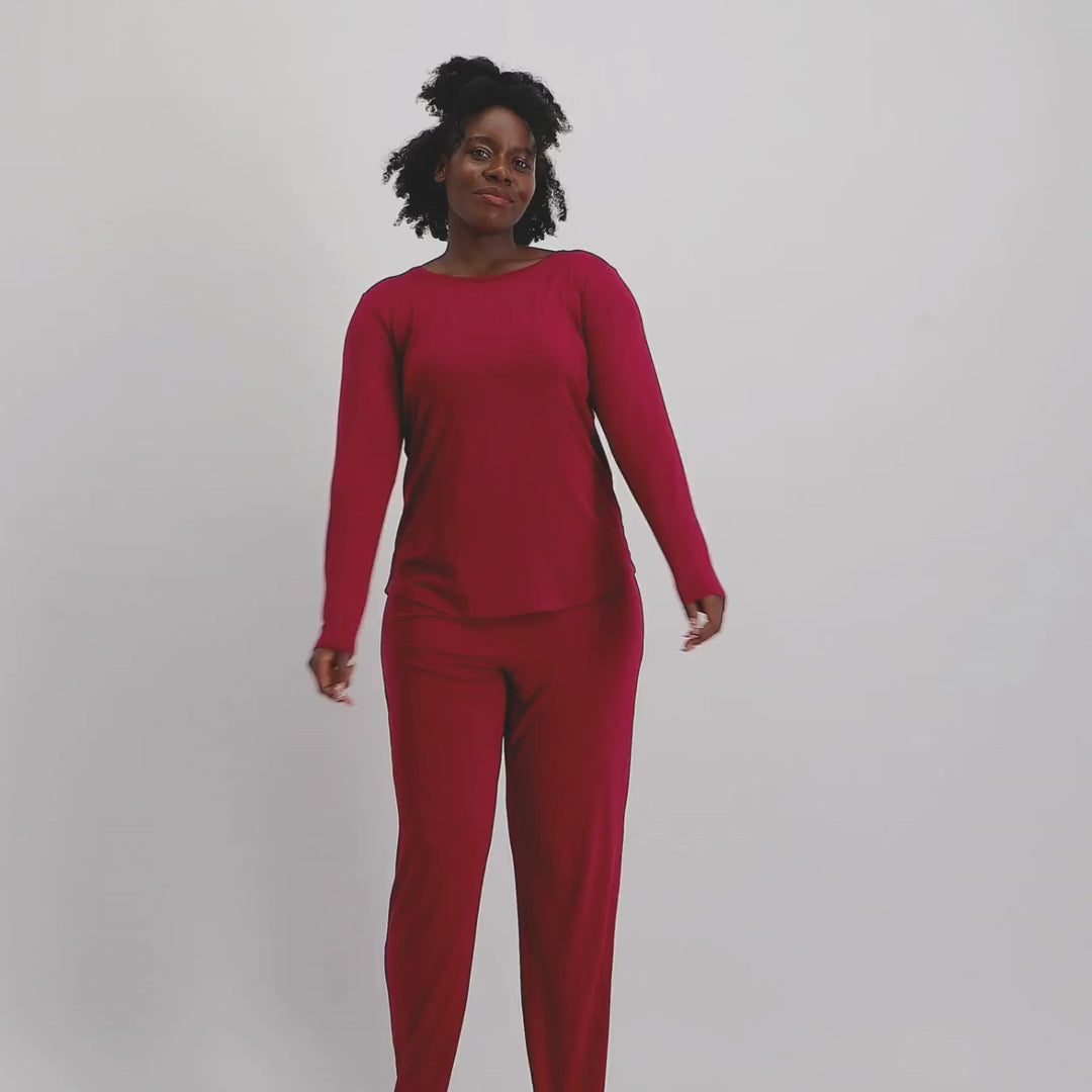 Elegant pyjamassæt til kvinder i bordeaux fra Bamboo Basics. Sættet består af lange bukser og en langærmet overdel – ideelt til afslappende stunder derhjemme. En tidløs kombination af komfort, varme og stil, perfekt som loungewear eller nattøj.